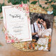 This elegant wedding invitation features watercolor floral bouquets in shades of peach and pink. Rose gold foil text for your details is surrounded by a rose gold frame. Back features your favourite photo. Easy to customize by clicking "Personalize".