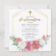 Elegant and classy pink and white rose floral with sage green greenery girl "Confirmation" script text design with geometric gold-toned lines frame.