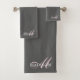 Un élégant monogramme rose et blanc sur un ensemble de serviettes gris. L'initiale rose a d'élégants swashes, tandis que le nom en gris est un style de police serif classique, imbriqué dans l'initiale rose. Style chic.