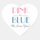 Elegant Pink or Blue Gender Reveal Sticker for your gender reveal party. White heart-shaped sticker with pink, blue and grey writing that says Pink or Blue, We Love You! Use for party favours or games.