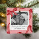 Elegant christmas holiday ornaments featuring a cute pink background, with a photo centrepiece adorned by a beautiful red watercolor ribbon and bow. Complete with your family name, the year and the seasons greetings "merry christmas".