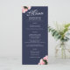 Elegant Pink Rose Bouquet Floral Wedding Menu. This modern floral wedding menu template has beautiful pink roses bouquet. The background is dark navy midnight blue. The text is in a white modern script. You can easily customize all the text - personalize it with the bride and groom name, wedding date and your wedding menu. The back side is in dark blue colour.