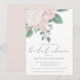 A beautiful modern bridal shower invitation, featuring a top corner bouquet of pink and white watercolor roses with green leaves, on a white background, offset with modern grey font. "bridal shower" is in modern calligraphy font.The reverse of the card is in solid blush pink.