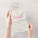 This is a beautiful and elegant wedding invitation called an "all-in-one" that contains a tear-away