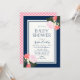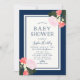 Elegant Floral Baby Shower invitation featuring pink roses, coral and yellow flowers, and green leaves with an off white centre and blue borders against a blue background on the front. Invitation has a sweet baby pink gingham back side. It's a perfect invitation for a girl baby shower. Check out baby shower items here https://www.zazzle.com/rosewoodandcitrus/gifts?cg=196748758771183969?rf=238364477188679314