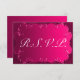 This charming wedding RSVP in fuchsia pink showcases a beautiful vintage theme reminiscent of old parchment, with a stylish frame of crimson scrolling elements and curlicues. The ornamental swirling frame surrounds classic script typography in white, with the traditional R.S.V.P. title. The back of the card features all the necessary details, such as room for guests' names and options for their attendance/non-attendance.