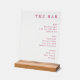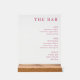 This acrylic sign features a clean, minimalist design with a white background and elegant pink typography. The layout is organized into three sections—Beer, Wine, and Spirits—highlighting various drink options in a sophisticated manner. The simple yet stylish font enhances readability and adds a touch of class to any bar or kitchen setting. Perfect for creating an inviting atmosphere, this sign serves as both a functional menu and a chic decorative piece.