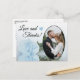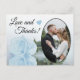 This beautiful postcard is a simple yet thoughtful way to thank your wedding guests. It features a lovely design with your wedding photo in an oval shaped frame, and a single long stemmed dusty powder blue coloured rose reflecting in a pool of water. The caption reads "Love and Thanks" and there is space for your custom note on the back as well as your signature.