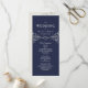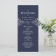 Élégant minimaliste moderne chic simple calligraphie marine programme de mariage bleu avec coeur romantique de corde argentée et dentelle dorée fleurie.