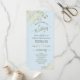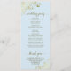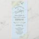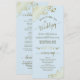 Ce magnifique programme de mariage présente un design élégant avec du texte doré sur un arrière - plan bleu poudre pâle et des boucles et tourbillons en faux feuille doré en dentelle dans les coins. Les titres sont écrits en calligraphie de script sophistiquée, et il y a de l'espace pour vos détails de cérémonie et de mariage, ainsi qu'un bref merci pour votre invité. Merveilleuse façon d'accueillir vos amis et votre famille à votre fête mariage.