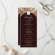 Cette carte de programme de mariage présente un arrière - plan rouge audacieux, agrémenté de fleurs dorées, créant un design riche et luxueux. En haut, une crête décorative encadre les initiales, tandis que le centre met en valeur les noms du couple et les détails complets du service mariage dans un agencement raffiné. L'association spectaculaire du rouge et de l'or est synonyme d'élégance, de grandeur et de célébration, faisant de cette carte de programme un choix idéal pour les mariages formels et les occasions festives.