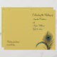 Des plumes de paon élégantes mettent en valeur ce programme de mariage sur un arrière - plan jaune safran pâle. Il est imprimé sur le papier léger, il est donc facile à plier en deux.