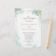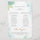 Elégant programme de mariage avec délicat arrière - plan de tache d'aquarelle et verdure haut dans les teintes turquoise, aqua, bleu poussiéreux et vert doux. Détails d'or en feuille, mouchoirs et calligraphie manuscrite moderne. Possibilité de modifier et d'ajuster le texte en sélectionnant la personnaliser plus loin. Avant avec les détails de la cérémonie mariage, retour avec les noms de la fête de mariage et message de remerciement pour vos invités. Ambiance moderne et élégante. Également disponible sans détails de verdure mais en gardant des taches d'aquarelle sur l'arrière - plan. Une partie de notre collection "Airy Blue and Green Watercolor" avec une variété de produits de coordination disponibles.