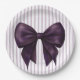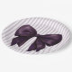 Make your baby shower truly memorable with these elegant paper plates. A stunning, realistic purple bow is the centerpiece, set against a backdrop of delicate purple and white vertical stripes. These plates are ideal for a sophisticated baby party, providing a beautiful and practical way to serve your guests. The combination of the deep purple bow and subtle stripes creates a charming and festive atmosphere.