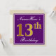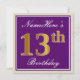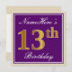 This simple and elegant birthday party invitation design features a personalized message like "NameHere’s 13th Birthday" (with the "13th" having a faux/imitation gold-like colouring look) within a purple-coloured square area featuring a simple border outline. The name is in an elegant white-coloured script-like text, and can be personalized. The back features customizable invitation details. A birthday party invitation like this could perhaps be used when inviting people to a birthday party being held for somebody who is celebrating their thirteenth birthday. [~Z0000226]