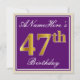 This simple and elegant birthday party invitation design features a personalized message like "ANameHere’s 47th Birthday" (with the "47th" having a faux/imitation gold-like colouring look) within a purple-coloured square area featuring a simple border outline. The name is in an elegant white-coloured script-like text, and can be customized. The back features customizable invitation details. A birthday party invitation like this could perhaps be used when inviting people to a birthday party being held for somebody who is celebrating their forty seventh birthday. [~Z0000226]