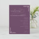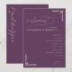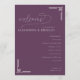 This wedding program features a sophisticated deep purple background with elegant cursive and clean sans-serif typography, creating a formal yet inviting atmosphere. The layout is vertically oriented, with decorative geometric lines adding a modern touch to the classic design. Perfect for weddings, it includes customizable sections for ceremony details while maintaining a cohesive and stylish look. The use of negative space highlights key information, ensuring readability and a polished appearance ideal for significant celebrations.