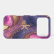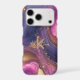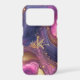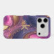 Elevate your tech with a touch of modern luxury. This stunning iPhone case features a mesmerizing fluid art design, blending deep plum, vibrant magenta, and soft lavender hues with shimmering gold glitter accents for a realistic agate geode effect. The design features a chic, minimalist monogram and a gold-toned script signature that you can easily customize with your own name.