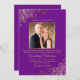 This beautiful wedding invitation is stylish, simple and elegant. It features gold script lettering on a purple background with floral faux foil filigree in each corner. The design includes your photo of picture in a golden frame along with all of the important details. The back has a customizable QR code and details note so you can direct your guests to a website for information and RSVP.