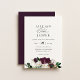 Modern and elegant floral wedding invitation. Beautiful bouquet of dark purple and ivory flowers with rich green and golden leafy greenery. Coordinating dark plum purple colour backing. Invitation features chic typography design style mix of calligraphy and bold type.