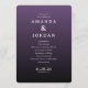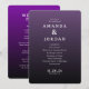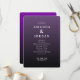 Ce programme de mariage présente un design élégant et minimaliste avec un fond violet dégradé qui passe de nuances profondes à foncées. La mise en page est orientée verticalement et centrée, créant une apparence formelle et équilibrée. Une typographie claire met en évidence les détails de la cérémonie dans une hiérarchie claire, utilisant des polices serif grasses pour les noms et des polices sans-serif pour les détails de l'événement, véhiculant une atmosphère sereine et sophistiquée parfaite pour une célébration de mariage moderne.