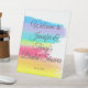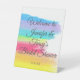Beautiful rainbow bridal shower welcome pedestal sign with pretty, artistic paint strokes full of bright color. This chic, colorful wedding party signage is perfect for an artistic LGBTQ couple or a gay and lesbian event. Personalize with the couple's names.
