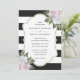 Invitation vos invités à votre élégante fête de mariage noir et blanc avec ces invitations de mariage rose fleuri avec des fleurs roses et verdure sur un arrière - plan rayé noir et blanc.