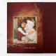Elegant and striking modern holiday photo template featuring deep red and gold artisan background with thin-line gold botanical leaf graphic and text fields. Panels feature complementary red background, blank label element, photo templates and additional text fields.