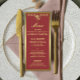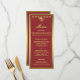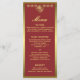 An elegant wedding menu of gold and red, with golden elements to add a touch of elegance and style to your wedding or other special occasion. Designer notes: everything can be completely customized, from the gold elements at the top of the menu to the wording of each course. Change (or even remove) if you wish. The reverse side of the menu shows the bridal couple monogram (which can also be changed or removed completely too).