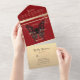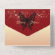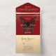 This unique red all-in-one wedding invitation features an elegant black butterfly design adorned with floral details and delicate sparkle-like accents. With built-in RSVP, a space for your wedding website, and a personalized photo and return address on the back, it’s a bold yet romantic choice for couples seeking something symbolic and artistic. Please note: A separate envelope is required for mailing.