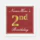 This simple and elegant paper napkin design features a message like "NameHere’s 2nd Birthday" (with the "2nd" having a faux gold-like colouring) within a red-coloured square area featuring a simple border outline. The name is in a white-coloured script-like text, and can be personalized. Napkins like these could perhaps be used at a birthday party for somebody who is celebrating their second birthday. [~Z0000138]