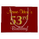 This simple, elegant birthday gift bag design features a personalized message like "Name-Here’s 53rd Birthday!" (with the "53rd" having a faux/imitation gold-like colouring look) on a red coloured background. The name is in script-like, yellow-coloured text, and can be customized. A personalised birthday gift bag like this could perhaps be used when giving a present or gift to somebody who is celebrating their fifty third birthday. [~Z0000253]