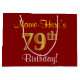 This simple, elegant birthday gift bag design features a personalized message like "Name-Here’s 79th Birthday!" (with the "79th" having a faux/imitation gold-like colouring look) on a red coloured background. The name is in script-like, yellow-coloured text, and can be personalized. A personalised birthday gift bag like this could perhaps be used when giving a present or gift to somebody who is celebrating their seventy ninth birthday. [~Z0000253]