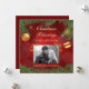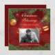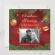 What an elegant, pretty flat Christmas card that has the added bonus of having a photo template! The top and bottom have a border of green pine needles and pine cones. A few gold stars sparkle in the background, and two red and gold decorated tree bulbs hang at the sides. The images and text are placed on a gradient red background with a subtle circle pattern. Your own photograph is shown beneath two shiny gold clip images, and there are three text fields in light gold. The images and text are placed on a gradient red background with a subtle circle pattern. The back of the invitation is solid matching red. *Thanks to Scrap and Tubes for clip art used in this design.