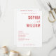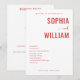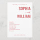 This wedding program features a minimalist and elegant design with a soft, off-white background. The layout is centred around bold red serif fonts for the names "SOPHIA" and "WILLIAM," separated by a delicate cursive "and." The ceremony details are neatly listed in a clean sans-serif font, maintaining a sophisticated and formal mood. The colour palette of muted reds and neutrals enhances readability and focuses attention on the essential information, making it perfect for a chic and modern wedding celebration.