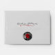 A classic, timeless elegant single red rose in a soft circle vignette. The rose is the only colour in a monochrome background. A red curved scroll line highlights the bride and groom's names.
