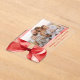 Celebrate the season in style with this elegant Christmas card featuring a stunning red watercolor bow against a transparent acrylic background. Personalize the design by adding your horizontal family photo in a unique offset layout. Your holiday greeting is displayed in classic red serif lettering, accompanied by your family name in an elegant handwritten script. Perfect for spreading festive joy while showcasing your personal touch.