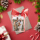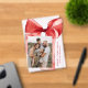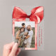 Celebrate the season in style with this elegant acrylic Christmas card featuring a stunning red watercolor bow against a transparent acrylic background. Personalize the design by adding your vertical family photo in a unique offset layout. Your holiday greeting is displayed in classic red serif lettering, accompanied by your family name in an elegant handwritten script. Perfect for spreading festive joy while showcasing your personal touch.
