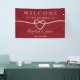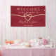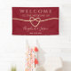 Simple, elegant, red welcome wedding banner with gold rope heart and modern script.