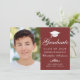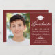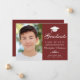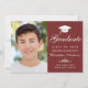 Send your family and friends a unique personalized photo graduation card featuring your custom photo on the left and to the right a white grad cap with the word "Graduate", class/year, name and other ceremony details in formal white script calligraphy to personalize on a red maroon background. Designed by ©Susan Coffey.