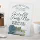 This beautiful self-standing pedestal sign will let your guests know that there is no seating plan so they can sit wherever they like. It features a simple yet elegant design with a single long-stemmed teal or aqua coloured rose reflecting in a pool of water. Text reads: Come as you are, stay as long as you can, We're family now, so there's no seating plan. Perfect way to invite your guests to mingle and meet each other.