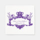 Paper disposable napkins perfect for the wedding reception, couple's shower, or rehearsal dinner, features a purple print regal design of scrolls, leaves, and royal crown with an area you can add the bride and groom's names and wedding date, all on a white background.