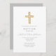 Personalized Elegant Religious Cross Grey Script Boy Baptism Invitation.