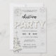 An elegant, unique black and white Christmas party invitation template featuring a pine tree and snowflakes covered in rhinestones and glitter (these are digital effects, not real stones or glitter!) and a shimmering, winter background, together with the word PARTY covered in the same (digital) rhinestones and glitter. The title is written in modern calligraphy. Modern, simple, clean typography that is fully editable.