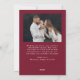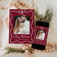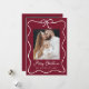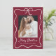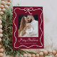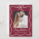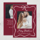 Celebrate the season with our Elegant Ribbon Bow Burgundy 2 Photo Holiday Card. This charming design showcases your cherished family photo surrounded by a festive white ribbon frame, complete with a bow at the top. The festive burgundy background beautifully highlights the handwritten "Merry Christmas" greeting in white script, which can be customized with a greeting of your choice. Add your family name for a personal touch. The back features space for a second photo and a heartfelt message. Perfect for sharing joy with loved ones this holiday season!