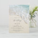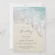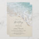 This elegant summer beach wedding invitation is perfect for destination weddings, and features elegant romantic script calligraphy and classic text on a close-up photo of a beach shoreline with an ocean wave and sea foam.