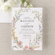 Create a romantic and personalized touch for your wedding with this elegant invitation, featuring the couple's first names and wedding details beautifully encircled by an oval wreath of watercolor flowers and greenery. In addition to soft shades of dusty rose, pink, blue, purple, white, and green, this design includes touches of golden yellow, adding warmth and vibrancy to the overall aesthetic. Perfect for spring and summer weddings, this delicate floral wreath creates a timeless, nature-inspired look. Ideal for garden weddings, outdoor ceremonies, or intimate celebrations, this invitation offers a unique and elegant way to announce your special day. Customize with your details to reflect your love story in a beautiful, personalized way.