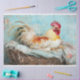 Add a touch of rustic sophistication to your creative projects with this decoupage tissue paper design. Featuring a regal rooster with vibrant plumage resting in a vintage wicker basket draped with a floral-patterned blanket, this artwork is set against a serene turquoise background adorned with delicate floral motifs. Perfect for farmhouse-themed events, gift wrapping, DIY crafts, or rustic-chic decor, this unique design blends timeless charm with artistic elegance, elevating any project with luxury and style.