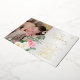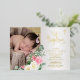 Beautiful pink and white roses elegant photo gold foil "Baptism" design featuring a lovely bouquet accented with fern and eucalyptus greenery with real gold foil text. All text is editable except for script text "Baptism" and cross. Design also features a washed watercolor pink background with a repeat of the floral bouquet on the bottom right corner on back. Composite design by Holiday Hearts Designs.