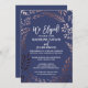 This elegant rose gold and navy elopement reception invitation card is perfect for a classy elopement party. The design features a stunning blush pink leafy frame on a dark blue background and is paired with a dazzling cursive font. RSVP cards are sold separately.